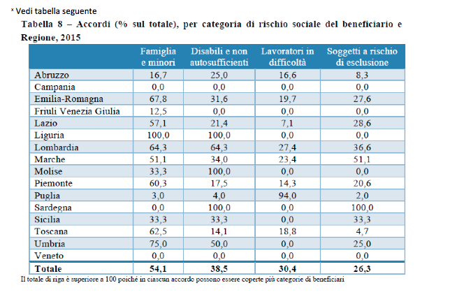 Per quanto riguarda la categoria di rischio sociale negli accordi sono indicati a scalare: la famiglia e i minori (54,1%); i disabili e non autosufficienti (38,5%); lavoratori in difficoltà (30,5%); soggetti a rischio di povertà ed esclusione sociale (26,3%). Le intese relative a questi soggetti a rischio risultano in crescita rispetto al 2014 (+5,9 punti percentuali).