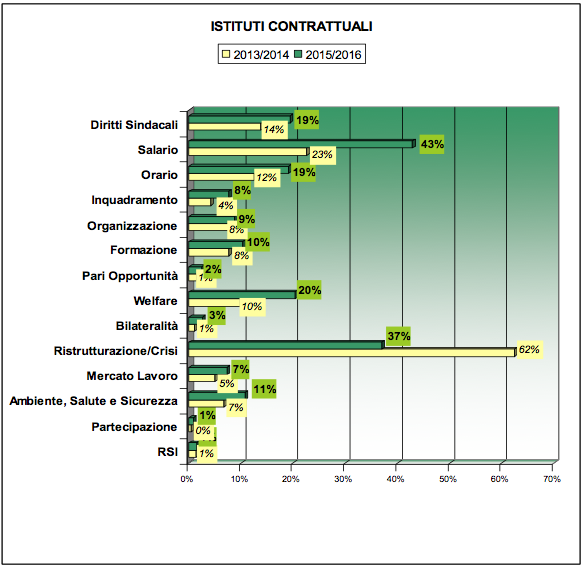 La contrattazione collettiva ha dimostrato un elevato tasso di resilienza durante tutta la dura recessione economica ed occupazionale vissuta dal nostro paese e nei cambiamenti strutturali che questa ha comportato. Essa non solo ha accompagnato in chiave difensiva la estesa gestione delle crisi, ma si sta riposizionando su nuovi obiettivi e campi d’azione.