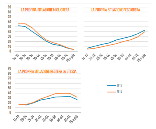 Grafico 2 – Giudizio sulle prospettive future per classe di età. Anni 2013 e 2014.