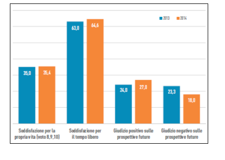 In merito a questo aspetto, il rapporto evidenzia un atteggiamento cauto da parte dei cittadini. Pur in presenza di una quota consistente di persone molto soddisfatte della propria vita, l’incertezza generata dalla crisi incide ancora in maniera significativa sulla percezione dello stato di benessere soggettivo, che nel complesso si presenta stabile sia nel 2013 che nel 2014, ma con incoraggianti segnali provenienti da alcune inversioni di tendenza.