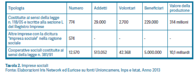 3. Il rapporto Iris presenta indagini multidimensionali che tendono a indagare vari aspetti del Terzo settore IV aiutando a chiarirne i contorni e suggerire ipotesi. Ci limitiamo ad esaminarne le parti che riguardano le potenzialità generali dell’impresa sociale ed in particolare la cooperazione sociale. In effetti la definizione giuridica di Impresa sociale non ha prodotto quantità significative: sono 774 le imprese costituite ai sensi della legge n.118/05 a cui si aggiungono 574 imprese con dicitura impresa sociale nella ragione sociale). Le attese di sviluppo non sono state corrisposte. Non a caso è una delle organizzazioni non profit oggetto della riforma.