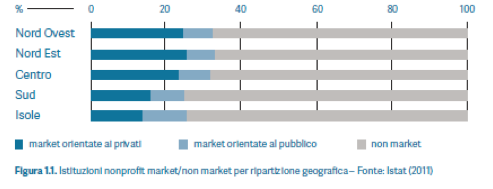Le istituzioni non profit non market sono 209.059, le market orientate al privato sono 67.466 e quelle orientate al pubblico 24.666. C’è una diversa ripartizione tra aree geografiche, anche in rapporto al tasso di imprenditorialità VII.