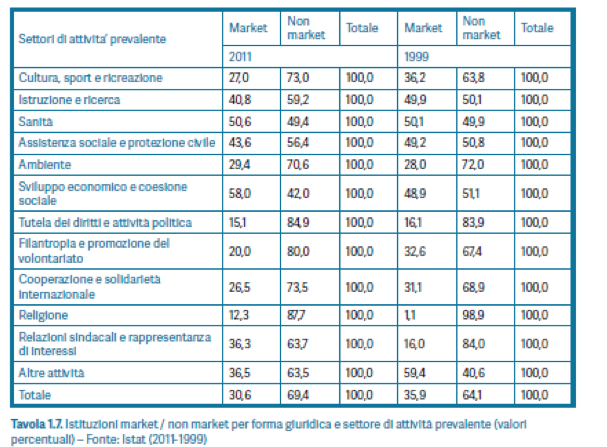 Il confronto dei settori di attività prevalenti tra gli anni 2011 e 1999 evidenzia una diminuzione in quasi tutti i settori delle istituzioni market tranne che nelle attività di relazioni sindacali e rappresentanza degli interessi X, della religione, dello sviluppo economico e coesione sociale, dell’ambiente . XI