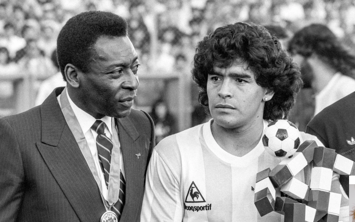 Parlando di calciatori è d’obbligo iniziare le valutazioni partendo dal campo di gioco. Qui i valori sono chiari; nel gioco a terra i due giocatori sono stati equivalenti (ognuno può mettere le piccole differenze che vuole, ma in tutti i casi saranno e dovranno essere proprio minime); nel gioco aereo non ci sono confronti. Pelé ha avuto un colpo di testa che equivaleva alle giocate di piede, un‘elevazione fantastica con la capacità di rimanere in alto più a lungo degli altri. Nei dribbling si equivalgono? Forse sì, ma il “drible de vaca” che nel mondiale del 1970 Pelé giocò al portiere dell’Uruguay non l’ho più rivisto in un campionato del mondo: il pallone scivolò senza essere toccato verso la destra del portiere e Pelé si lanciò a sinistra (ripeto, senza toccare il pallone) rincorso dal portiere che, finalmente accortosi, non poté che voltarsi e vedere il pallone in rete.