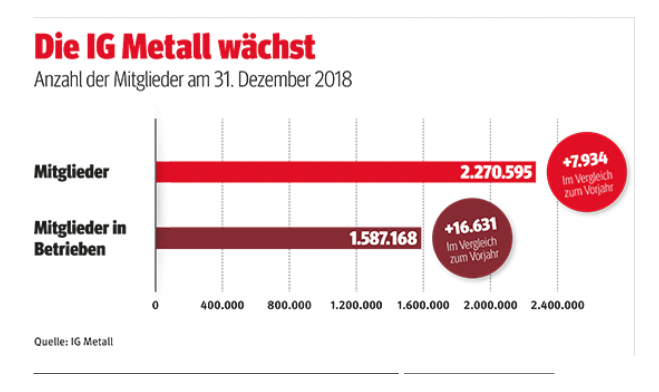 *Traduzione di Giovanni Graziani della sintesi pubblicata il 21 gennaio 2019 sul sito dell’Ig Metall – https://www.igmetall.de/die-ig-metall-waechst-tarifabschluss-gut-angenommen-30193.htm).