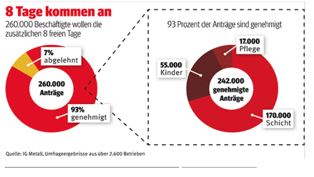 Questa nuova possibilità è stata apprezzata. 260.000 persone del settore hanno avanzato la richiesta degli otto giorni liberi. E di queste richieste, nonostante l’alto costo a carico delle imprese, ne sono state autorizzate il 93 per cento. Questo è quel che risulta da un’indagine svolta dall’Ig Metall in 2600 imprese.