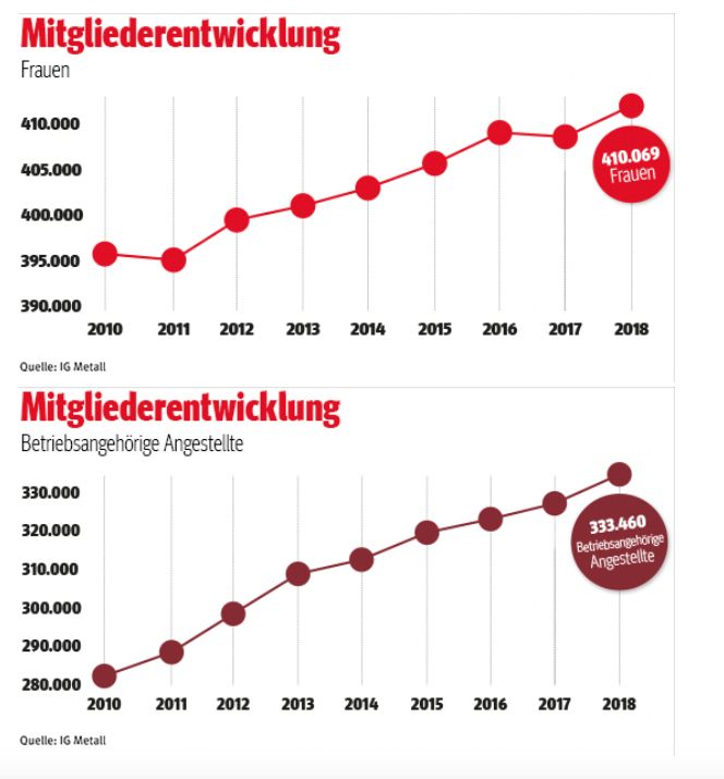 Crescite consistenti sono state registrate dall’Ig Metall fra le donne (+0,8 per cento), persone con una storia di immigrazione (+2 per cento) e gli impiegati (+2,5 per cento). Fra i tecnici diplomati (“ingegneri”) l’Ig Metall è cresciuta addirittura del 13,7 per cento. Inoltre, sono 231.860 gli aderenti all’ IG