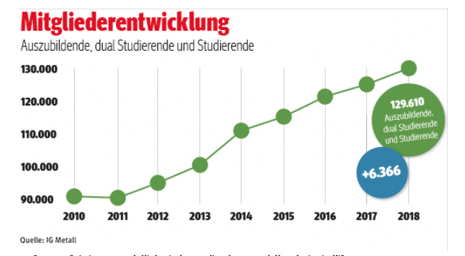 Metall che hanno meno di 27 anni. Nella categoria che comprende gli apprendisti, quanti fanno un percorso di studio duale e gli studenti, il numero degli aderenti è di 129.610, che equivale ad un aumento di 6.366 iscritti. In particolare, sono più di 50.000 gli studenti iscritti all’Ig Metall.
