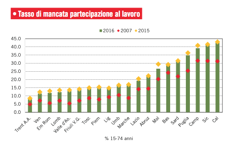 Agli estremi opposti si collocano, invece, la Calabria che ha avuto nella media del 2016 un tasso di mancata partecipazione al lavoro del 42.4 per cento, ovvero più di cinque volte il dato del Trentino Alto Adige. In Calabria nel 2007 il tasso era 31.2 per cento e, quindi, da allora è cresciuto di oltre undici punti. Una condizione non troppo dissimile è quella della Sicilia (41.8 per cento nel 2016 e 31.4 per cento nel 2007) e della Campania (rispettivamente 39.2 per cento e 31.6 per cento). Seguono con posizioni appena migliori la Puglia (34.8 per cento nel 2016), la Sardegna (31 per cento), la Basilicata (28.7 per cento), il Molise (26.7 per cento) e l’Abruzzo (22.2 per cento).
