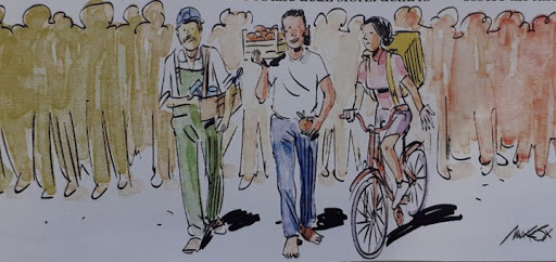 Nella vignetta di Makkox che trovate in fondo all’articolo, in prima fila sono rappresentati gli ultimi arrivati nel mondo del lavoro attuale, i rider e i nuovi braccianti immigrati.