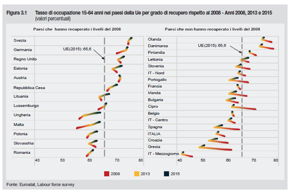 A questo punto il Rapporto esamina le dinamiche del mercato del lavoro prima in Europa e poi in Italia. Nella UE c’è stata anche nel 2015 una lenta ripresa dell’occupazione, 2,4 milioni (+1,1%) con il tasso di occupazione che sale al 65,6% (+0,8%). Non si recuperano ancora i posti di lavoro persi dal 2008 ma soprattutto si marca una differenza tra chi ha recuperato il tasso di occupazione del 2008 e chi no.
