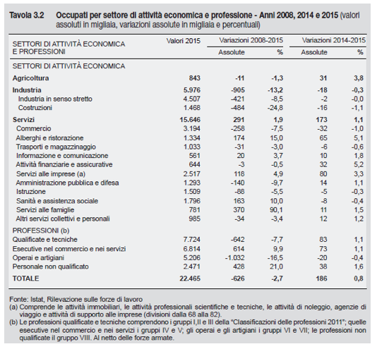 La Tavola 3.2 ci rappresenta gli occupati per settori di attività economica e professione. Anni 2008, 2014, 2015.