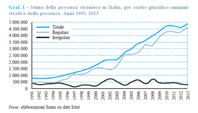 Questo è un grafico utile per capire il trend e vedere come il raddoppio della presenza sia avvenuto negli ultimi 10- 11 anni, passando da 2,5 milioni a più di 5 milioni. Infatti, ad aggiornamento del grafico, nel 2014 i cittadini stranieri regolarmente soggiornanti erano 5.364.000 (dati Idos), il 52,7% dei quali sono donne. Nel 2015 avrebbero raggiunto i 5,5 milioni, e con una presenza di circa 300.000 irregolari.