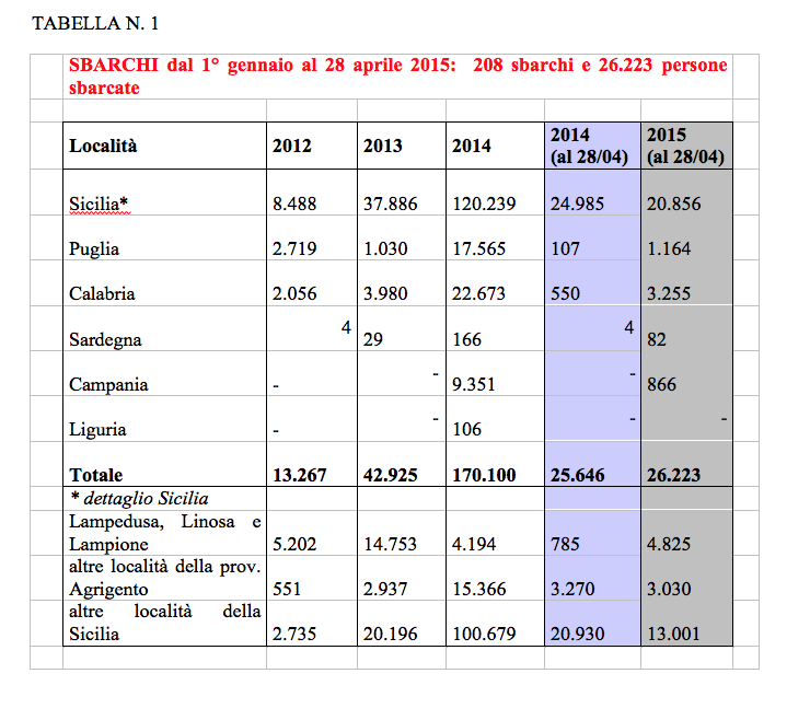 Fino a fine Aprile 2015 i dati sugli arrivi da sbarchi dall’Africa erano esattamente in linea con il 2014, anche se dalle tre seguenti tabelle e nel confronto fra i primi 4 mesi dell’anno 2015 su 2014, già si possono intravedere le nuove tendenze e quanto ci attende (bisognerebbe dire come Europa e non come Italia) per l’anno in corso. Dalla Tabella N. 1 vediamo che su un totale di circa 26.000 sbarcati nei primi 4 mesi dell’anno diminuiscono quelli verso la Sicilia di circa 4.100 (ma aumentano di 6 volte quelli diretti a Lampedusa, Linosa e Lampione), mentre aumentano di 1.060 verso la Puglia, di 1.700 verso la Calabria, di 78 verso la Sardegna, di 866 (da zero) verso la Campania. In totale gli sbarchi sono cresciuti di 577 unità.
