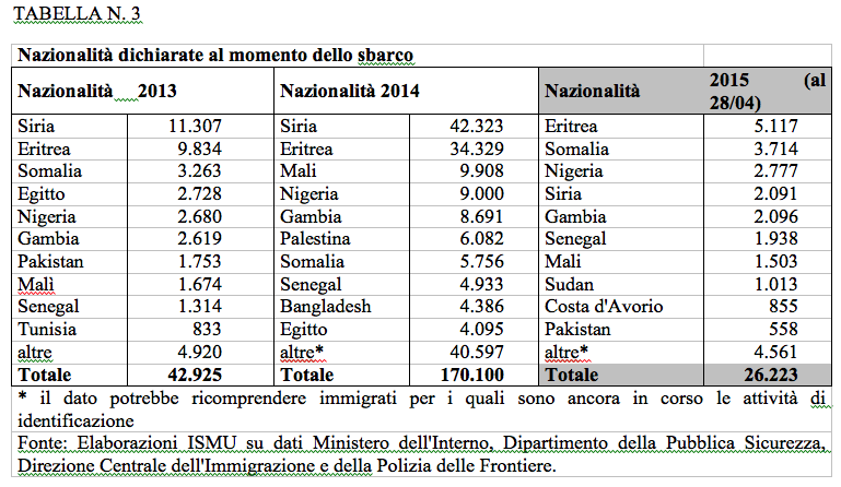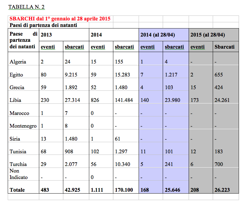 Dalla Tabella N. 2 si vede che, a sostanziale parità degli sbarcati il numero dei natanti sono 208, contro i 168 del 2014, il che vuol dire imbarcazioni più piccole. La quasi totalità dei natanti (173 su 208) partono dalla Libia, anche se i Libici sbarcati sono poche decine, con un carico di 24.261 persone su un totale di 26.223.