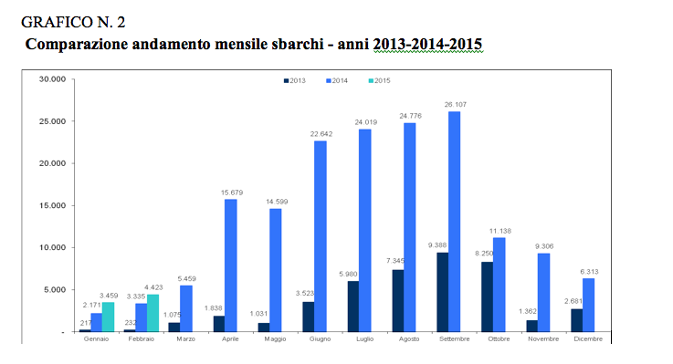 Nel grafico seguente abbiamo la comparazione mensile degli sbarchi negli ultimi tre anni.