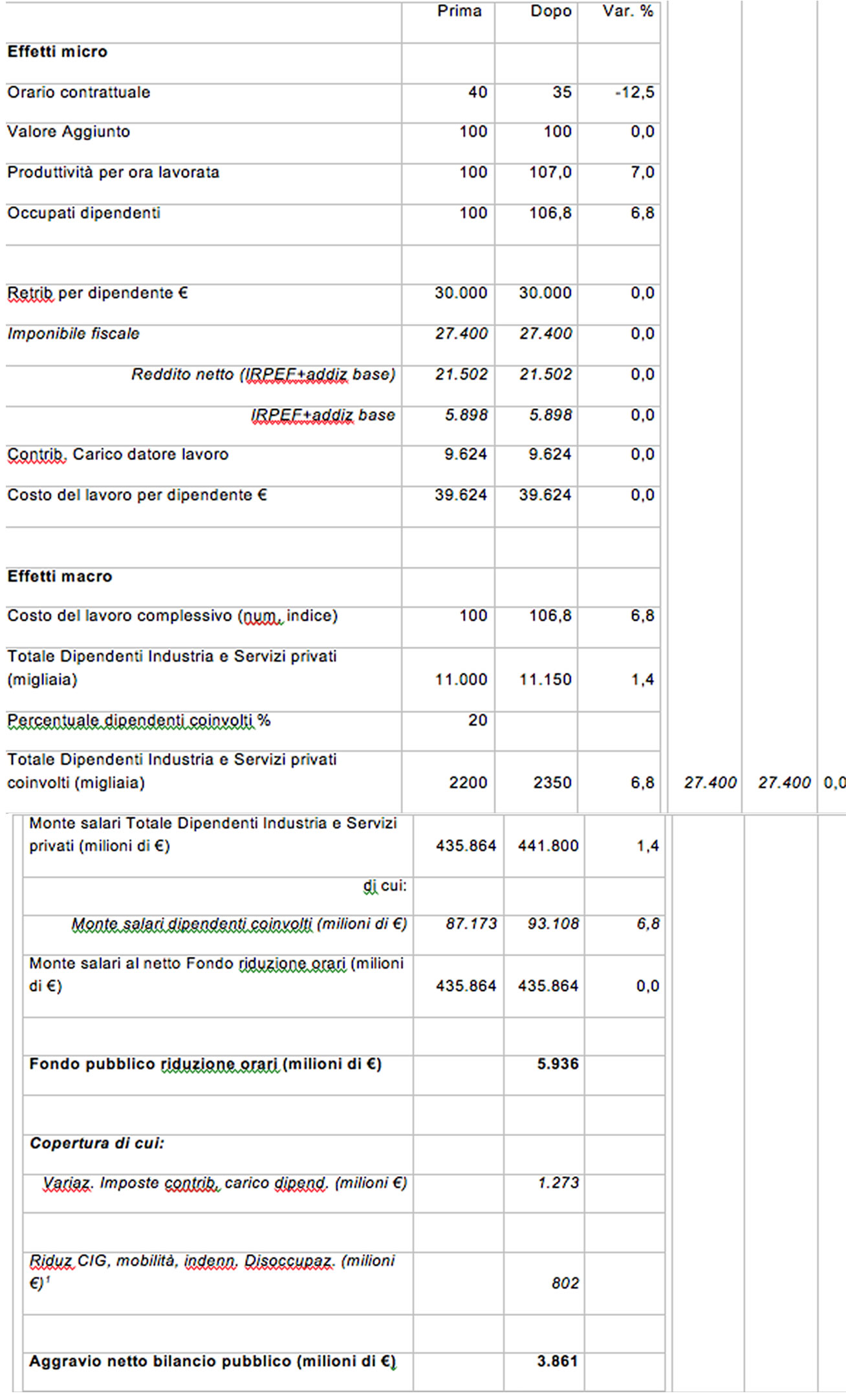 Dalla tabella si evince che, se questo universo si orientasse a contrattare una riduzione del 12,5% dell’orario annuo individuale, si otterrebbe un incremento di 150.000 nuovi occupati, con un aggravio per le casse dello Stato di circa 6 miliardi di euro. Si tratta di una bella cifra, ma non tale da mettersi le mani nei capelli. E come si vede nell’ultima parte della tabella si attiverebbero ricadute positive per le casse dello Stato, tali da rendere meno oneroso l’intervento.
