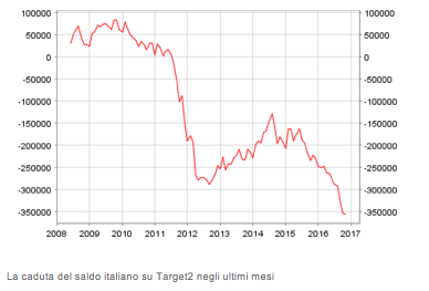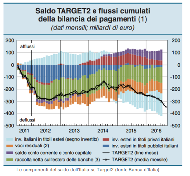 Il loro allarme sulla fuga di capitali dall’Italia parte dal crescente passivo della Banca d’Italia su Target2, l’infrastruttura di regolamento dei pagamenti tra i paesi dell’euro. Nell’estate del 2012, quando solo l’impegno di Mario Draghi a fare «tutto ciò che serve» per salvare l’euro riuscì ad alleviare le pressioni per la rottura della moneta unica, il passivo italiano sul sistema Target2 aveva segnato il suo nuovo record a 289,3 miliardi. A luglio di quest’anno quel livello è stato superato e a fine novembre il rosso della Banca d’Italia ha raggiunto un nuovo primato a 358,6 miliardi di euro, più del 20% del Pil.