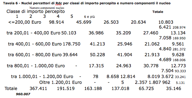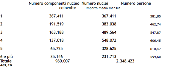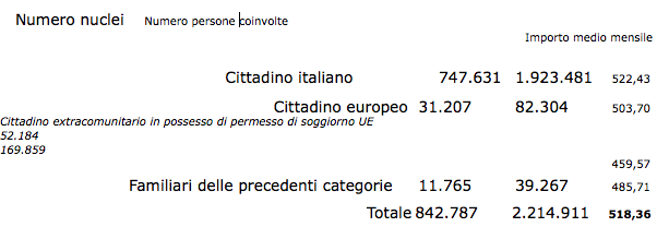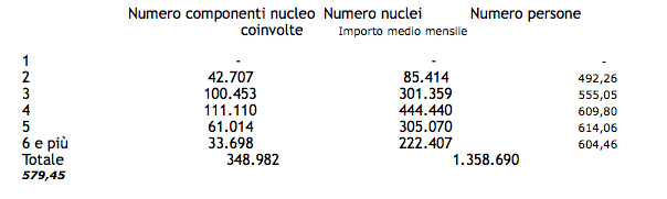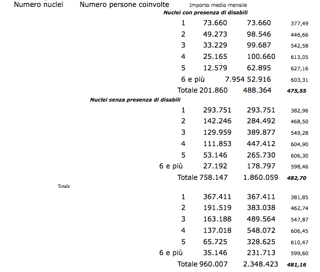I nuclei beneficiari ammontano a 842.787 e coinvolgono 2.214.911 persone. L’importo medio mensile accordato è di 518,36 euro.