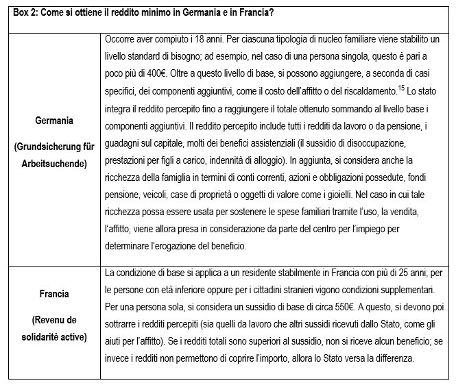 3 Si veda Minimum Income Policies in EU Member States, Directorate General For Internal Policies, Policy Department A: Economic And Scientific Policy, European Parliament, 2017. È invece poco frequente il caso di un reddito che sia erogato indipendentemente da ogni altra condizione. Un tale reddito è stato introdotto in via sperimentale in Finlandia, coinvolgendo circa 2000 volontari, me è stato presto interrotto.
