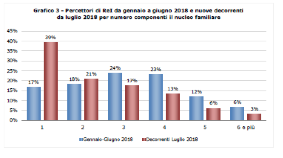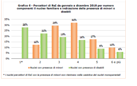 Aumentano in assoluto i nuclei con disabili (82 mila, rappresentano il 18% dei nuclei beneficiari, coprono il 17% delle persone interessate). La maggioranza dei nuclei con disabili è quella con un solo componente, che rappresenta il 28% del totale.