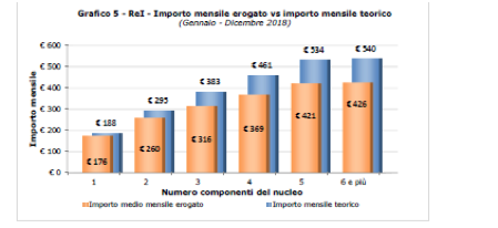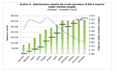 Delle 179 mila domande del periodo luglio-dicembre 2018, il 40% è imputabile a nuclei di un sola componente. Infatti l’eliminazione dei precedenti requisiti familiari ha avuto ricadute sulla distribuzione dei nuclei percettori per numero di componenti: è prevalente la classe con un solo componente. In precedenza, fino a luglio, risultava quella con tre componenti. Ciò ha determinato una diminuzione dell’importo medio mensile erogato: dal valore massimo di maggio 2018 pari a 312 euro si è scesi a dicembre a 282 euro.