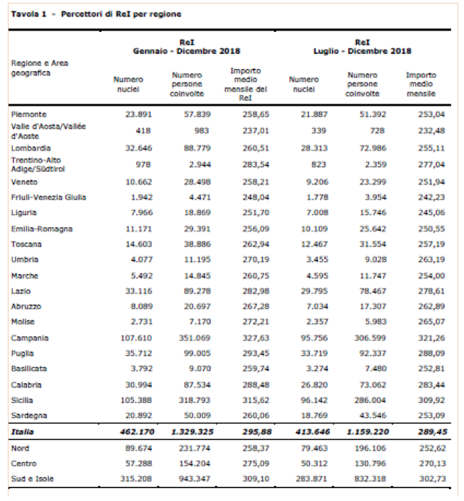 L’Osservatorio statistico dell’INPS ha fornito l’aggiornamento dei dati sullo stato di attuazione del Reddito di inclusione (ReI). In particolare le informazioni essenziali statistiche sui nuclei familiari percettori del beneficio economico. I dati riguardano il periodo che va da gennaio a dicembre 2018. Registrano gli effetti delle modifiche intercorse dal luglio 2018 in termini di allargamento della platea dei beneficiari e dell’ammontare del contributo.