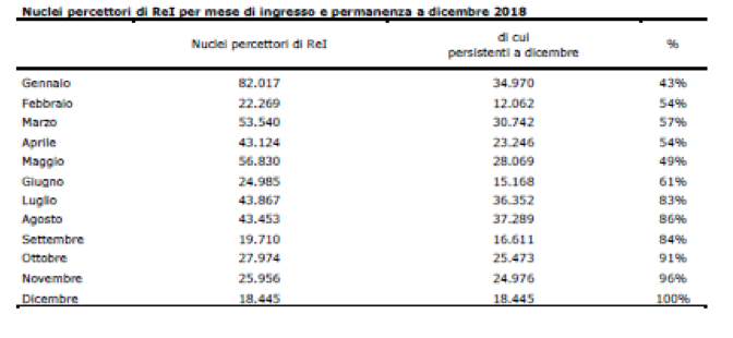 Dai dati risulta che solo il 43% del contingente iniziale, pari a 82 mila nuclei, ha percepito 12 mesi del beneficio; indica ciò la presenza di interruzioni della durata di erogazione. Inoltre esiste un elevato “turn over” della popolazione beneficiaria.