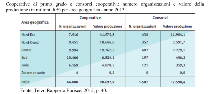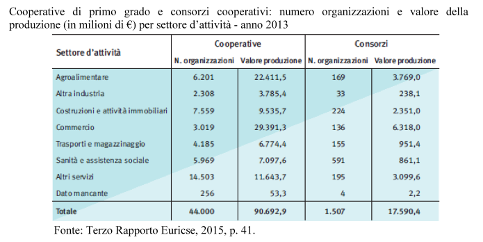 Nel 2013 le cooperative sono 67.062, cui si aggiungono i 1.904 consorzi per un totale di quasi 70.000 unità. Il valore di produzione è pari a 108 miliardi di euro: un dato che sottostima il fenomeno, perché solo 44.000 cooperative hanno il bilancio disponibile in banca. La dimensione del comparto è aumentata rispetto al 2011, quando le cooperative attive erano 61.398 e avevano un fatturato pari a 105 miliardi.