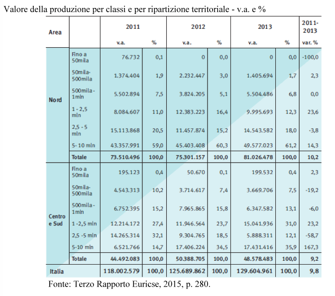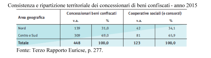 Di queste, 123 sono cooperative sociali, spesso costituite proprio per richiedere l’assegnazione del bene: circostanza che genera nuova occupazione e creazione di valore. Nello studio appena citato si parla di 4.176 occupati nel 2011, saliti a 4.211 nel 2013, per il 60% attivi al centrosud. In tempi di crisi, la cooperazione impegnata sui beni riesce dunque a mantenere una vitalità più accentuata rispetto al sistema delle imprese meridionali, incrementando – seppur di poco –l’occupazione (+0,8%) e il valore della produzione passato dai 118 milioni del 2011 ai circa 130 milioni di euro (+9.8%), prevalentemente nel settore dei servizi (al nord) e nell’agroalimentare (al centrosud).