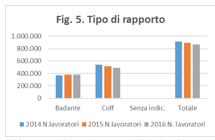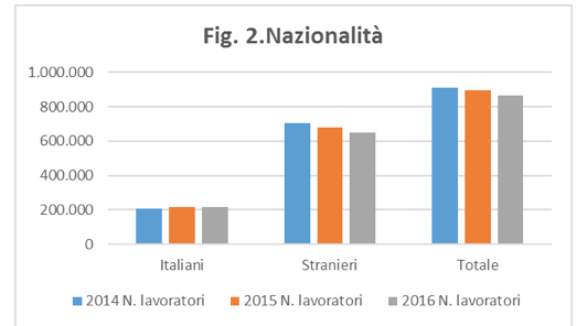 La diminuzione è di 27.386 rispetto al 2015 e di 42.670 rispetto al 2014. Il dato è sottostimato per la nota presenza di lavoro non dichiarato che farebbe salire ad oltre il milione la cifra degli addetti[viii].