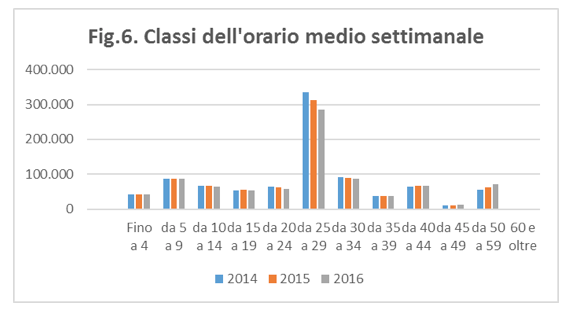 Tra le Classi di orario medio settimanale risulta prevalente quella da 25 a 29 ore[xv]. La quale risulta essere nei tre anni in diminuzione nella sfera di applicazione. Da riflettere quanto queste articolazioni di orario possano corrispondere ad esigenze di assistenza di persone non autosufficienti se non combinate con la presenza di caregiver familiari ovvero situazioni di prestazioni non dichiarate.