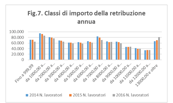La più diffusa tra le Classi di importo della retribuzione annua[xvi] è quella relativa a 1000 – 1999 euro, (in diminuzione nel triennio); in aumento la classe 13.000 e oltre. Le altre classi di importo sono quasi tutte in diminuzione.