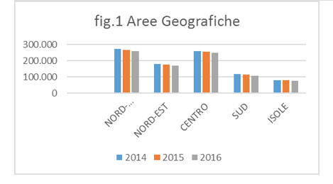 La distribuzione per aree geografiche degli addetti vede la prevalenza del Nord Ovest seguito dal Centro. Tale distribuzione non cambia sostanzialmente nel corso dei tre anni considerati[ix].