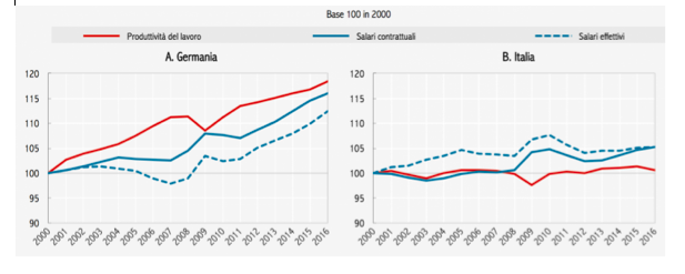 In Italia, invece, i salari reali (negoziati ed effettivi) stagnano (quelli contrattuali ancor più che in Germania), ma crescono sempre “troppo” rispetto alla produttività che da 15 anni è sostanzialmente ferma. Un settore pubblico inefficiente, risorse male allocate, investimenti in tecnologia scarsi, pratiche manageriali desuete e scarsa meritocrazia, insieme a una contrattazione collettiva sui salari ancora molto accentrata, sono tra gli elementi che contribuiscono a spiegare una stagnazione unica tra i paesi sviluppati.