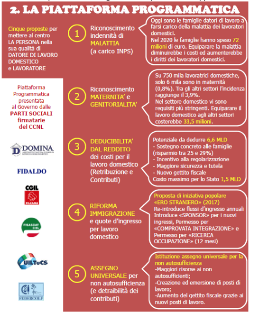 Viene infatti menzionato l’evolversi della progressiva costituzione dell’associazionismo di rappresentanza delle parti: datori di lavoro e lavoratrici, propedeutico al reciproco riconoscimento contrattuale e alsuo progressivo arricchimento, nella componente associativa (il pluralismo della rappresentanza dei datori di lavoro e dei lavoratori) e nei contenuti, ispirati ad un modello partecipativo ( gli istituti contrattuali riferiti al rapporto di lavoro, alla bilateralità, al welfare contrattuale). Ma anche l’attuale elaborazione congiunta di una piattaforma[ii] da sostenere nei confronti dell’attore pubblico (stato, regioni) per rendere sempre più dignitoso, trasparenteericonoscibile il lavoro domestico nei confronti di altre aree produttive[iii].E al fine di rendere sostenibili i contenuti della piattaforma vengono evidenziate le stesse ricadute economiche e fiscali delle proposte formulate.