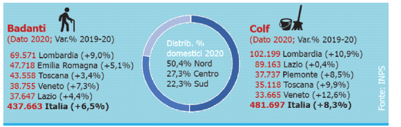 La distribuzione delle 73.666 badanti è maggioritaria in Lombardia seguita dall’Emilia Romagna, Toscana, Veneto e Lazio. Le 481.697 colf sono prevalenti il Lombardia, seguita da Lazio, Piemonte Toscana, Veneto[vi]