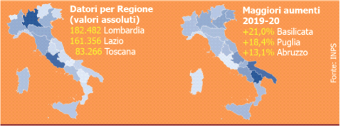 La distribuzione regionale dei datori di lavoro vede maggioritaria la Lombardia (182.482) seguita da Lazio(161.356) e Toscana (83.266)[ix].