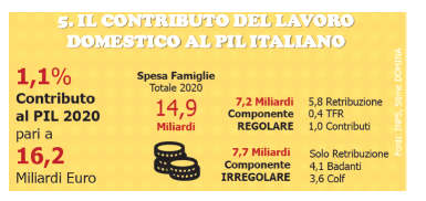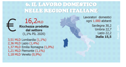 Il Rapporto si cimenta ampiamente nell’analisi del contributo fornito dal settore del lavoro domestico al PIL. Ne desume che per il 2020 questo sia stato pari a 16,2 miliardi di euro con una percentuale dell’1,1%. Nel computo della spesa delle famiglie inserisce i 7,2 miliardi del lavoro regolare (retribuzione, TFR, contributi vari) e i 7,7 della componente irregolare (solo retribuzione stimata delle badanti e colf)[x], con peso diverso tra le regioni[xi]