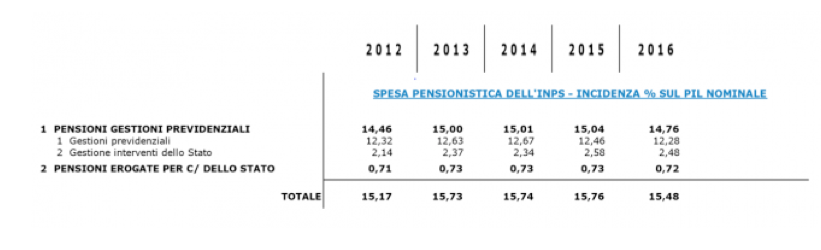Si dice spesso che la quota totale della spesa previdenziale sul Pil sarebbe intorno al 15,5 per cento. Tuttavia, se escludiamo la quota Gias – 2,48 – e le pensioni pagate per conto dello stato – 0,72 per cento – la percentuale della spesa per le prestazioni previdenziali si ferma a 12,28.