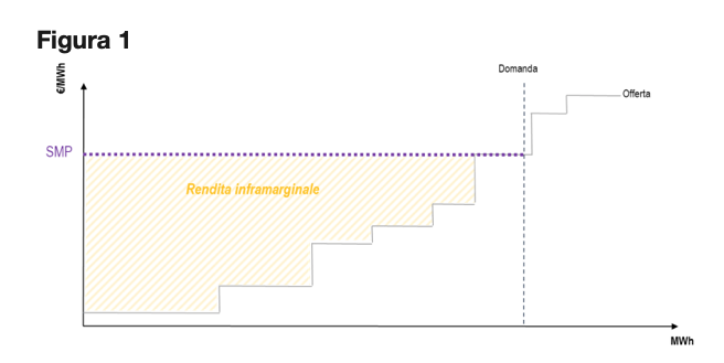 Il prezzo di equilibrio riflette i costi marginali dell’ultima centrale che deve entrare in esercizio per soddisfare la domanda e che, nella maggior parte dei casi, è alimentata a gas. Quel prezzo si applica a tutte le offerte accettate in quella fascia oraria, ragion per cui il sistema è noto anche come pay as clear o uniform price. In tal modo, mentre l’impianto marginale copre i suoi costi di esercizio, tutti gli altri ottengono ricavi superiori ai rispettivi costi marginali di breve termine. Attraverso la cosiddetta rendita inframarginale recuperano i costi fissi.