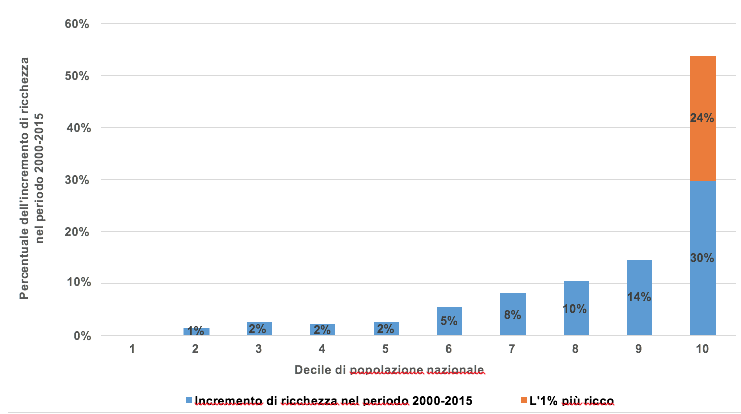 Distribuzione dell’incremento di ricchezza netta nel periodo 2000-2015 fra i decili della popolazione italiana