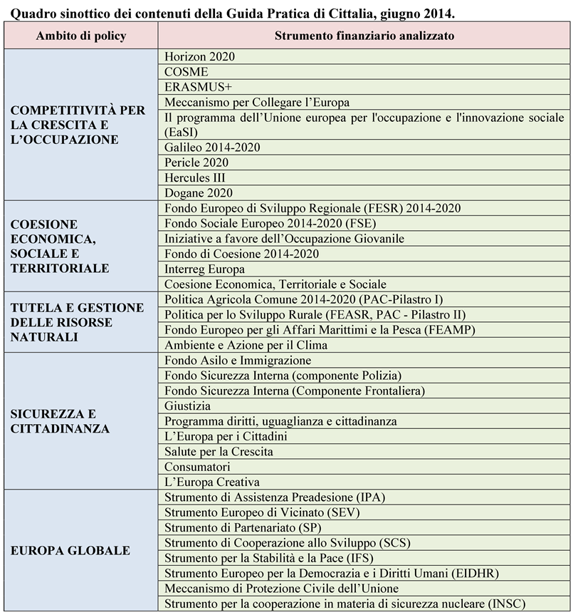 In questo quadro la Guida Pratica, già disponibile in inglese e da giugno 2014 anche in italiano, rappresenta uno dei primi strumenti disponibili oggi in Italia in grado di offrire una panoramica onnicomprensiva dei programmi di finanziamento offerti dall’Unione Europea per il 2014-2020. La nostra speranza, come centro di ricerche dell’ANCI che ha tra le sue principali indicazioni statutarie la missione di favorire uno sviluppo urbano sostenibile e integrato attraverso un miglior uso delle risorse finanziarie disponibili, è quella di contribuire a diffondere quanto più possibile la conoscenza di questi strumenti e di queste opportunità tra gli amministratori locali, tra i rappresentanti eletti e tra tutte quelle categorie di persone che rappresentano, in senso lato, gli attori dello sviluppo urbano. I beneficiari di questa Guida, tuttavia, non sono soltanto i Comuni, i quali potranno a loro volta diffonderla nei loro territori, ma anche le università, le associazioni, le piccole e medie imprese. Una delle principali caratteristiche dei Programmi comunitari è infatti quella di rivolgersi ad un ventaglio molto ampio di possibili beneficiari. Vi è di più: la nuova programmazione, soprattutto quella relativa ai fondi a gestione diretta, sarà caratterizzata da un approccio sempre più marcatamente rivolto ad una integrazione efficace di diverse tipologie di soggetti all’interno dei medesimi progetti, per favorire quella osmosi necessaria a rispondere a sfide economiche e sociali sempre più complesse. Per fornire un quadro sinottico, si propone di seguito una figura che ne sintetizza i contenuti.