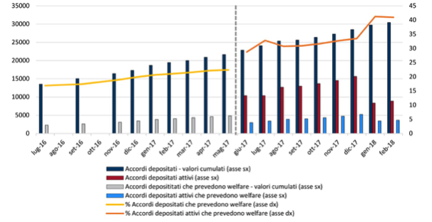 Figura 1. Contrattazione di secondo livello, premi di produttività e welfare: andamento degli accordi (luglio 2016-febbraio 2018)