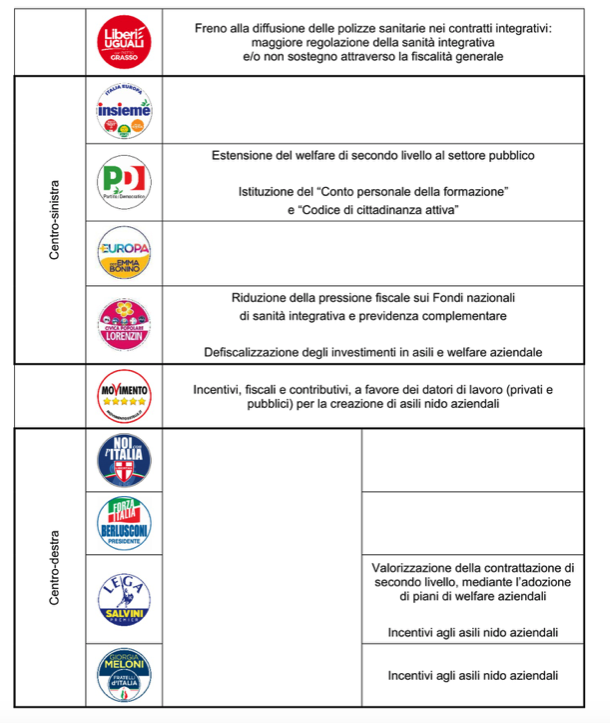 A fronte di questi significativi sviluppi sul piano delle policy e del vivace dibattito via via cresciuto – fra parti sociali, policy-maker e studiosi – su prospettive, sfide e limiti del welfare aziendale e contrattuale appena richiamati, in molte delle piattaforme programmatiche presentate dalle forze politiche in occasione delle ormai imminenti consultazioni elettorali il tema – come si vedrà nell’analisi che segue – non sembra essere riuscito a guadagnare particolare spazio.